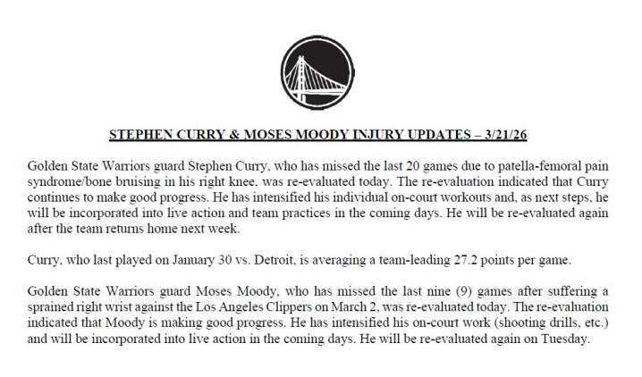 虎扑03月21日讯据金州勇士队官方发布的伤情更新报告,球队后卫斯蒂芬-库里与摩西-穆迪的康复进程均取得了积极进展。